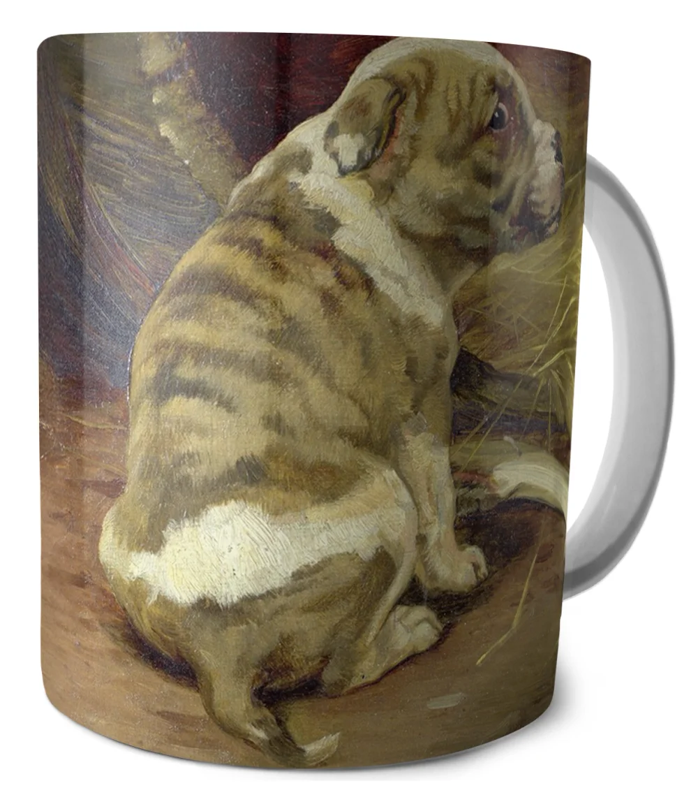 W tej urokliwej scenie William Henry Hamilton Trood mistrzowsko oddaje psychologię psiego bohatera, który z niemal nabożną czcią wpatruje się w swój cenny skarb. Zamiast szerokiego planu artysta serwuje nam intymne zbliżenie na małego buldoga, którego masywna sylwetka i skupione spojrzenie budują całą dramaturgię tego prostego, a zarazem pełnego emocji momentu. Ciemne, niemal mroczne tło i surowa tekstura siana w kojcu podkreślają domowy realizm, sprawiając, że biało-brązowa sierść szczeniaka i rzucona mu kość stają się najjaśniejszymi punktami kompozycji.