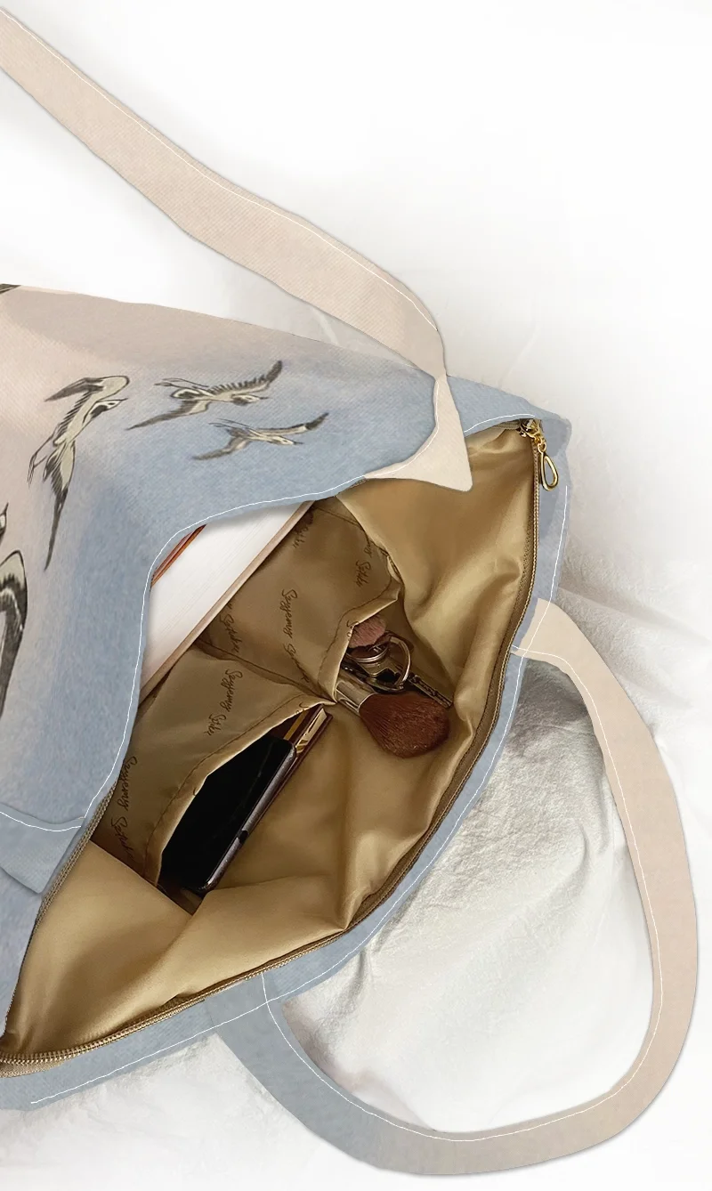 Dzięki nadrukowi na torbie możesz mieć reprodukcję tego dzieła zawsze przy sobie. Motyw obrazu „Pięć mew nad skałą w morzu” autorstwa Ohary Kosona nadaje torbie wyjątkowego charakteru i sprawia, że codzienny przedmiot staje się małym dziełem sztuki.