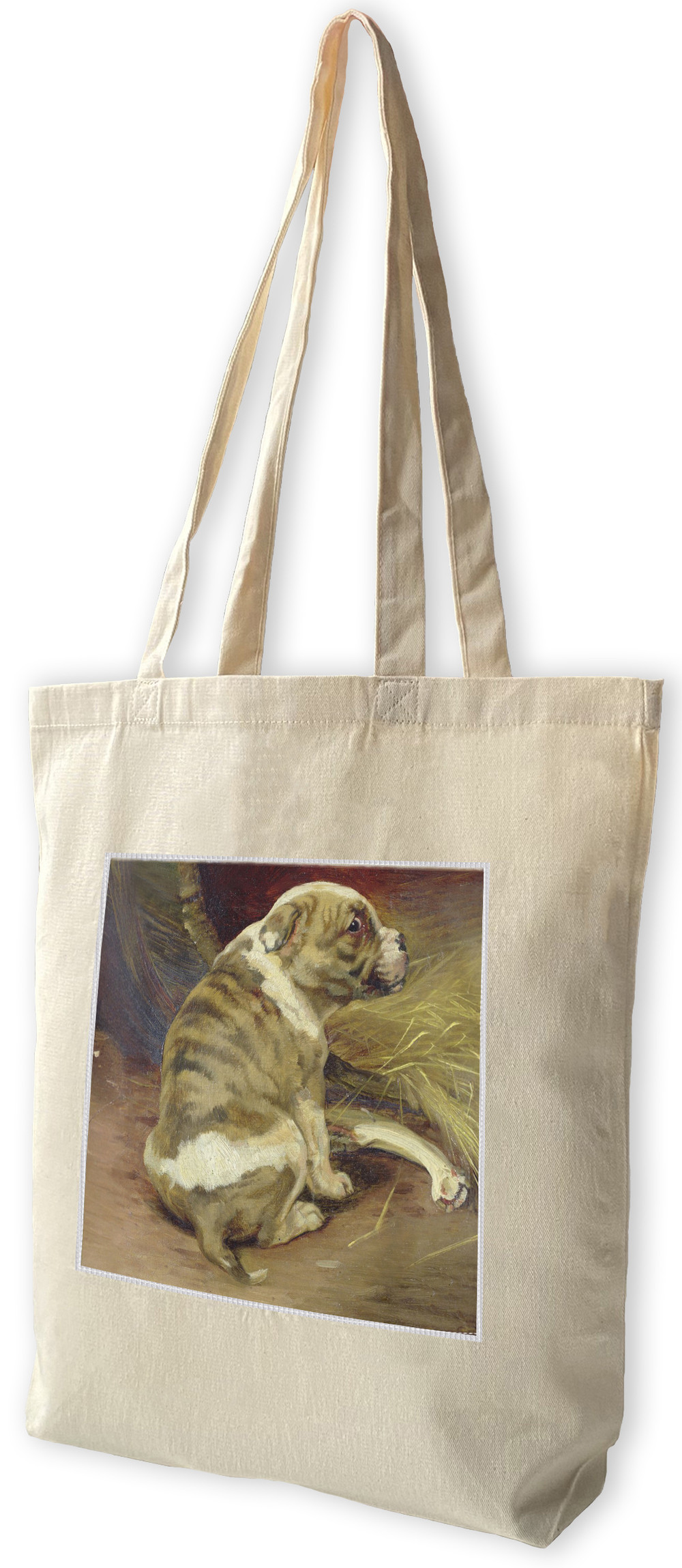 W tej urokliwej scenie William Henry Hamilton Trood mistrzowsko oddaje psychologię psiego bohatera, który z niemal nabożną czcią wpatruje się w swój cenny skarb. Zamiast szerokiego planu artysta serwuje nam intymne zbliżenie na małego buldoga, którego masywna sylwetka i skupione spojrzenie budują całą dramaturgię tego prostego, a zarazem pełnego emocji momentu. Ciemne, niemal mroczne tło i surowa tekstura siana w kojcu podkreślają domowy realizm, sprawiając, że biało-brązowa sierść szczeniaka i rzucona mu kość stają się najjaśniejszymi punktami kompozycji.
