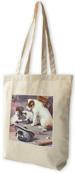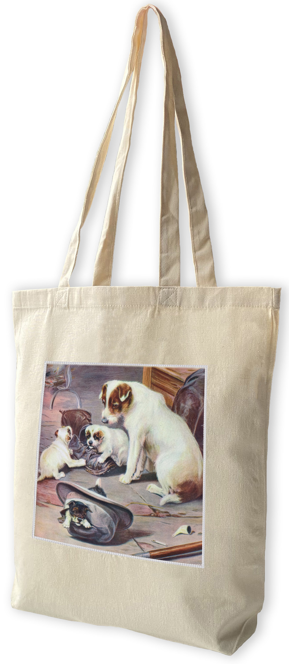 W tej uroczej scenie Trood z humorem portretuje psią rodzinę, która pod czujnym okiem matki urządziła sobie plac zabaw z porzuconych przedmiotów. Podczas gdy jeden maluch z zapałem gryzie stary but, drugi chowa się w kapeluszu, co tworzy pełen wdzięku obraz szczenięcej ciekawości. Artysta po mistrzowsku wykorzystuje ciepłe światło kominka, by podkreślić teksturę sierści i domowy, rustykalny klimat tego spotkania. Całość zachwyca naturalnością i prostotą, oddając radosny chaos, jaki do każdego wnętrza wnoszą młode zwierzęta.