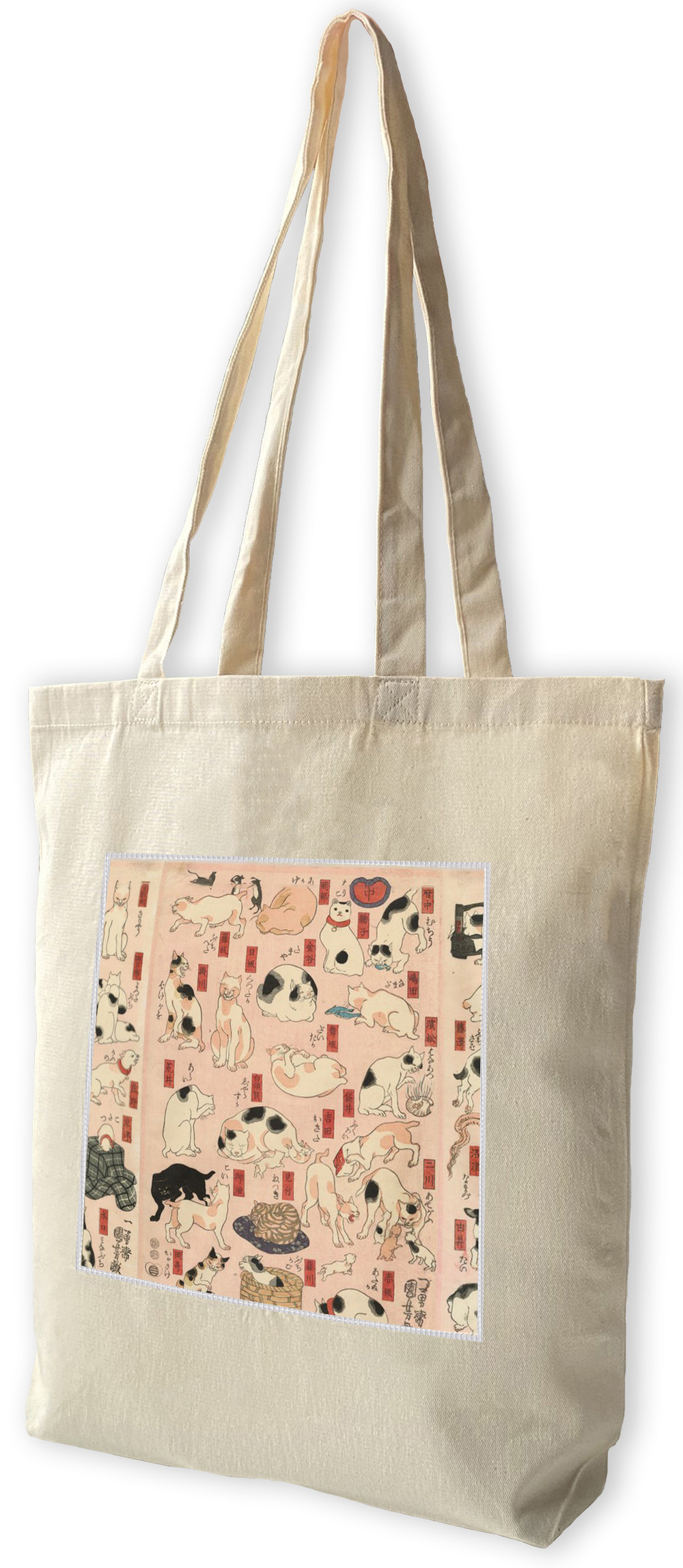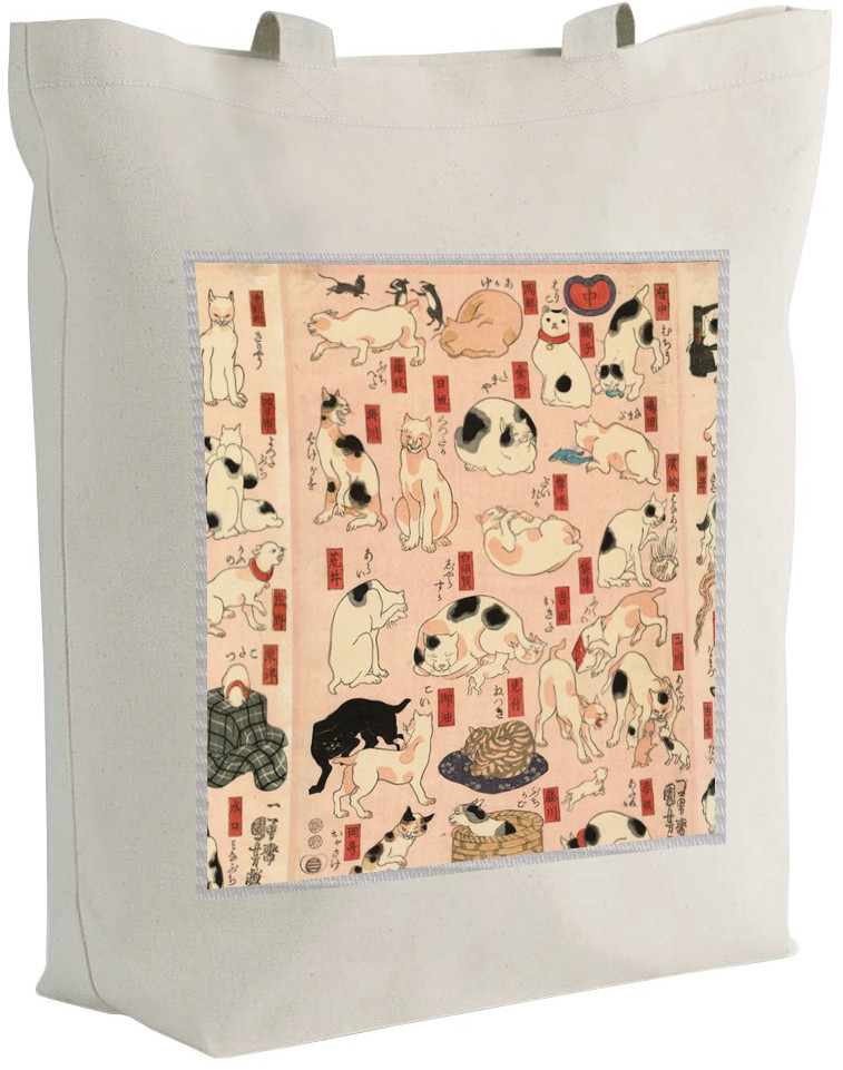 Reprodukcja obrazu 55 kotów reprezentujących pięćdziesiąt trzy stacje Tokaido na torbie z dużą naszywką