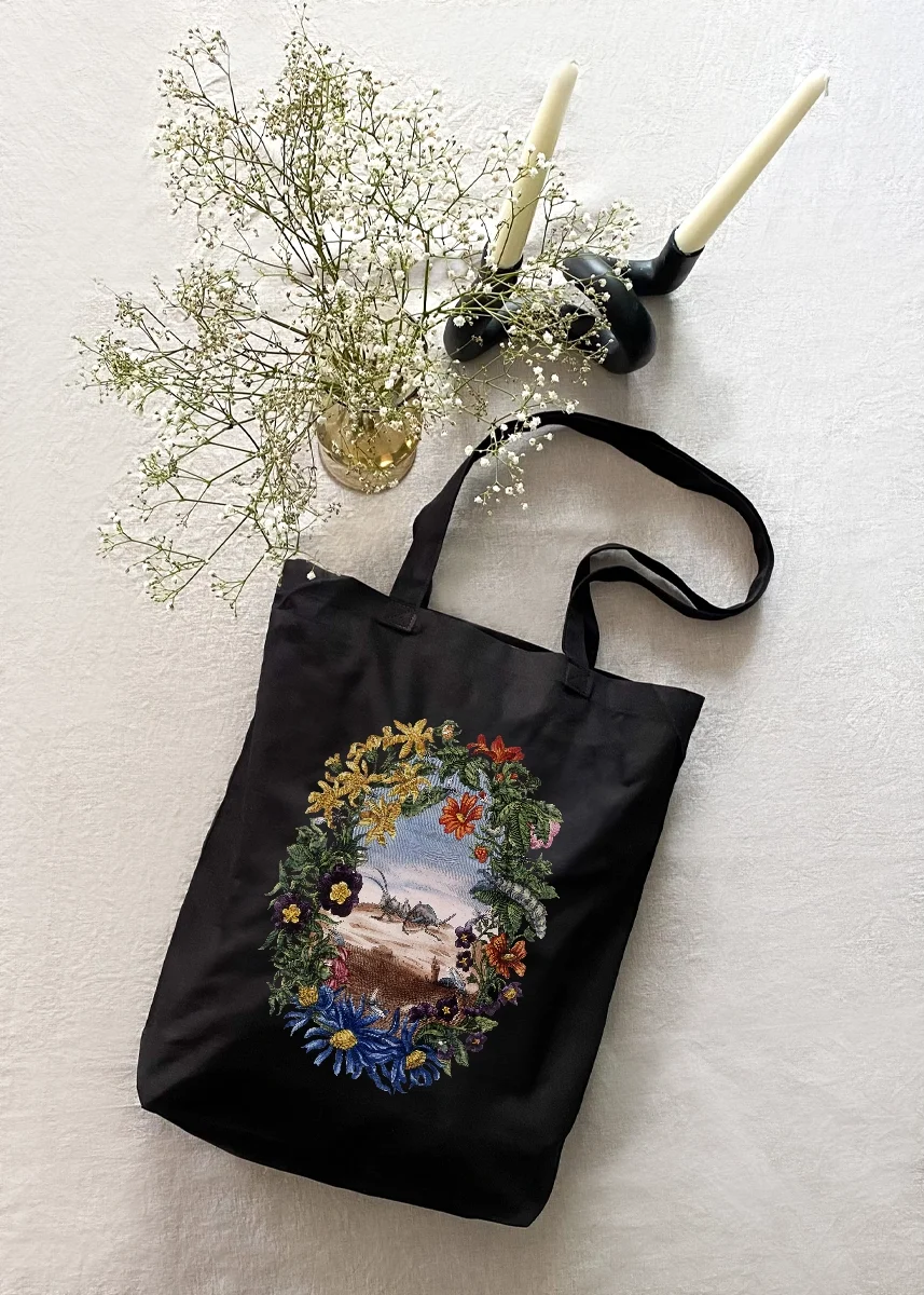 Torby dostępne są w dwóch klasycznych odcieniach: czarnym oraz naturalnym écru. Oba doskonale podkreślają artystyczny nadruk i pasują do wielu stylizacji – od codziennej po bardziej elegancką.