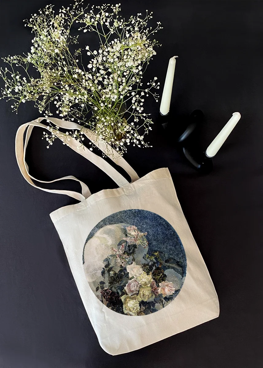 Torby dostępne są w dwóch klasycznych odcieniach: czarnym oraz naturalnym écru. Oba doskonale podkreślają artystyczny nadruk i pasują do wielu stylizacji – od codziennej po bardziej elegancką.
