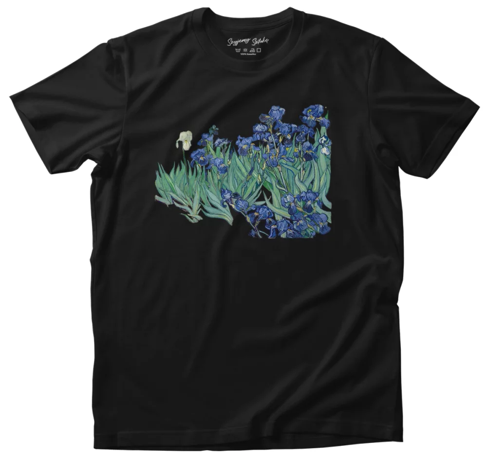 - Koszulka Irysy Vincent Van Gogh w wersji czarna. Stylowa koszulka z nadrukiem dzieła sztuki, łączy wygodę i artystyczny charakter. Idealna propozycja dla miłośników sztuki.