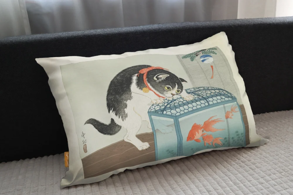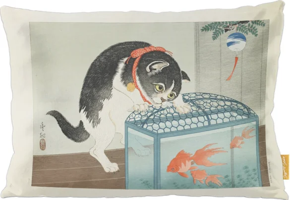 Poduszka z obrazem Kot i złota rybka Ohara Koson