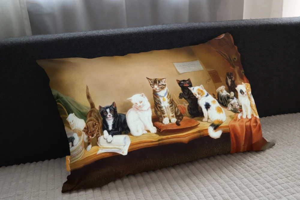 Ten panoramiczny obraz to przegląd kocich charakterów, od dostojnego lidera w obroży po rozbrykane maluchy. Trood z wielką precyzją oddał różnorodność umaszczeń i temperamentów, tworząc ciepłą scenę pełną domowego spokoju i dziecięcej energii. Każdy detal, od śpiących w koszyku po turlające się na plecach czworonogi, składa się na ujmujący portret kociej wspólnoty. To mistrzowski zapis codzienności, który zachwyca autentycznością i lekkością ujęcia tematu.