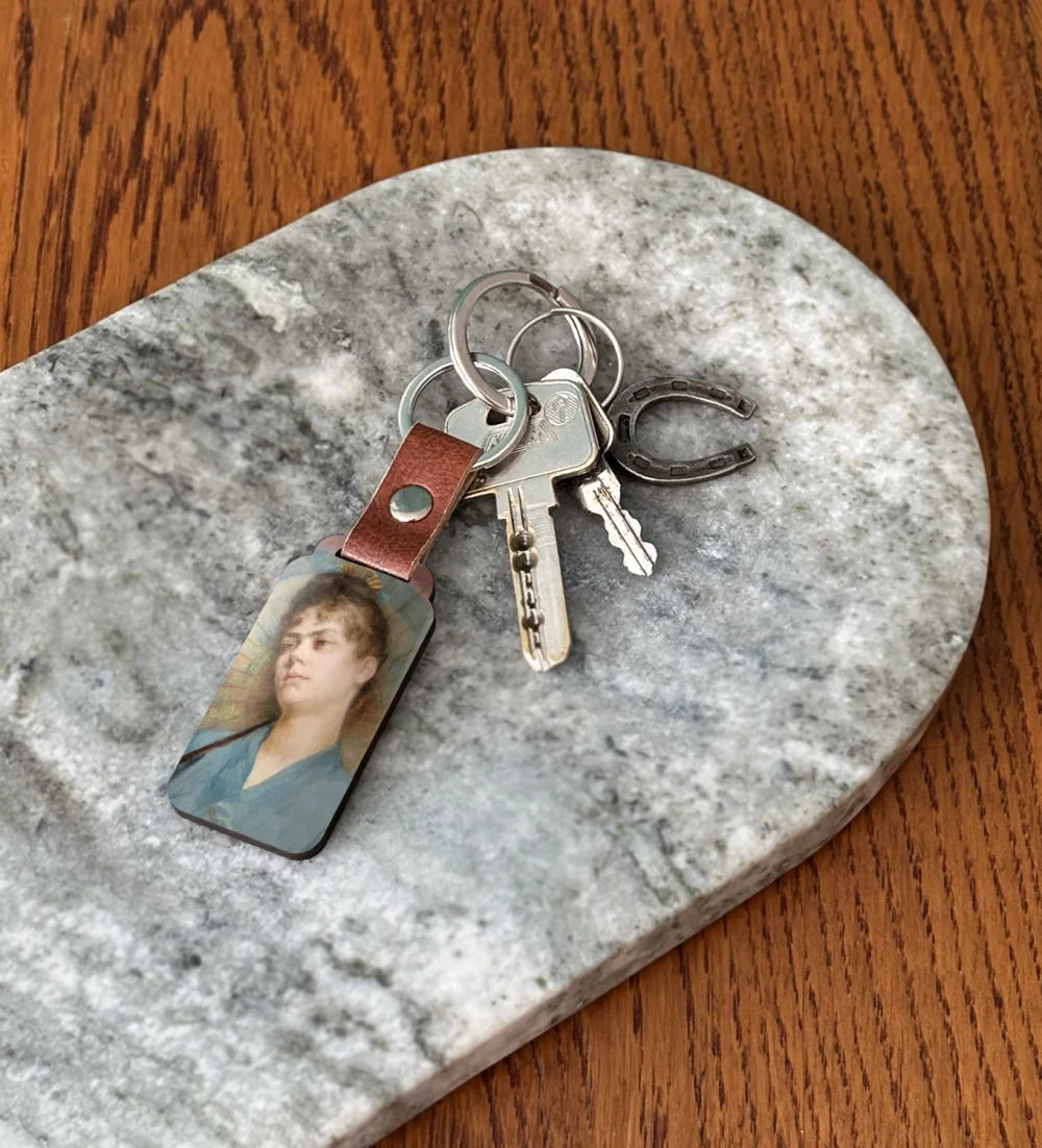 - ✨ Brelok do kluczy z obrazem Kobieta z japońskim parasolem Anny Bilińskiej-Bohdanowiczowej – mały, lekki i trwały gadżet ze sztuką. Świetny jako prezent i stylowy dodatek do kluczy lub torby. ❤️