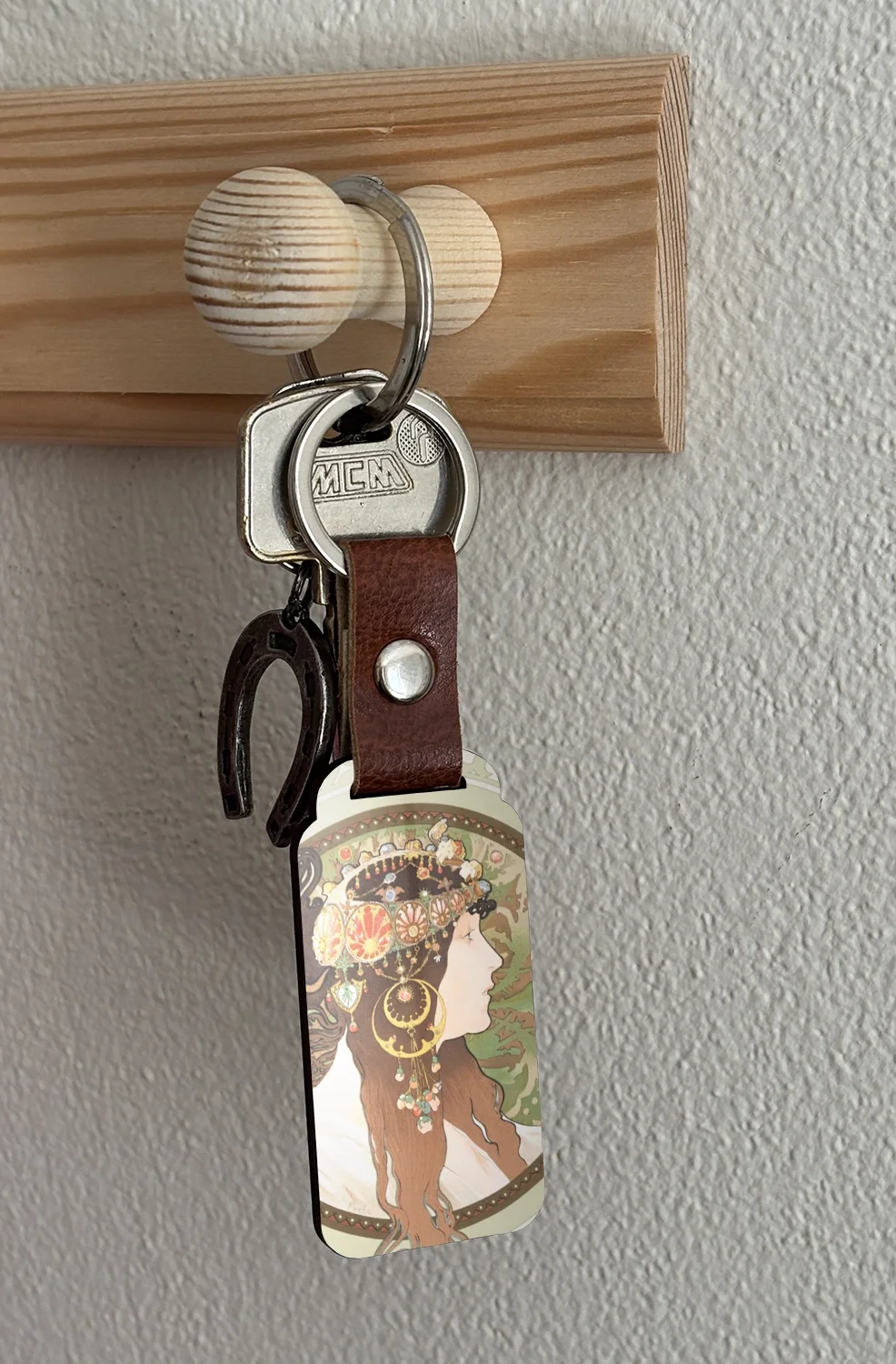 • ✨ Brelok do kluczy z obrazem Bizantyjskie głowy: brunetka Alfonsa Muchy – mały, lekki i trwały gadżet ze sztuką. Świetny jako prezent i stylowy dodatek do kluczy lub torby. ❤️