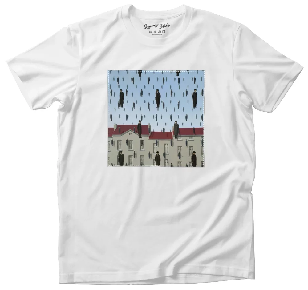 - Koszulka z naszywką Spadanie René Magritte Wysoka gramatura, trwałość i unikalny detal nadający charakteru. Każda sztuka szyta na zamówienie – wyjątkowa, solidna i stylowa!