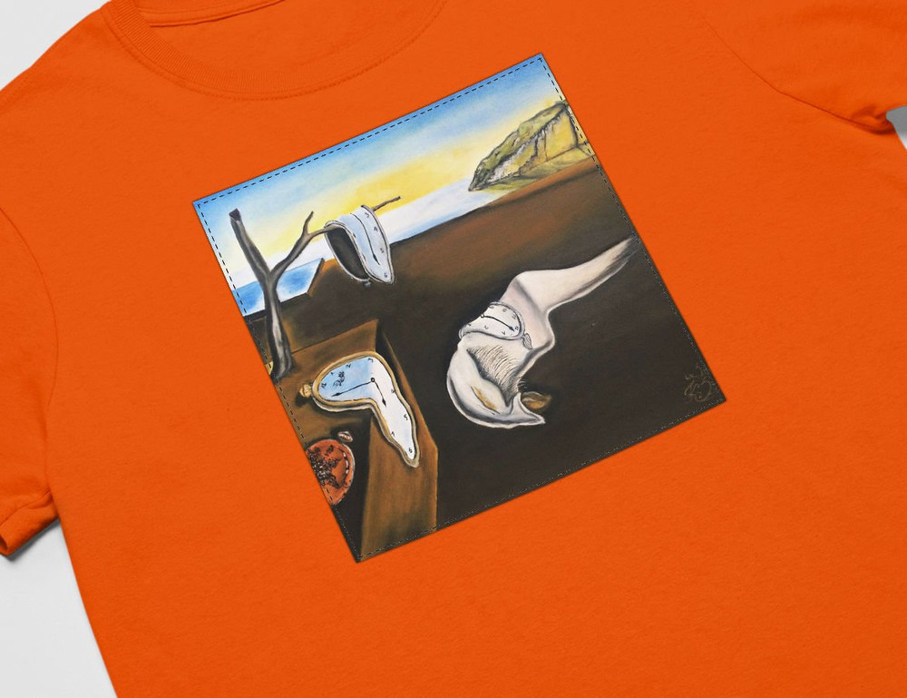 • Koszulka z naszywką Trwałość pamięci Salvador Dali Wysoka gramatura, trwałość i unikalny detal nadający charakteru. Każda sztuka szyta na zamówienie – wyjątkowa, solidna i stylowa!